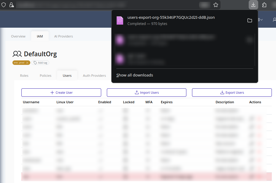 Use user export to download organization users as JSON for migration, review, or backup workflows.